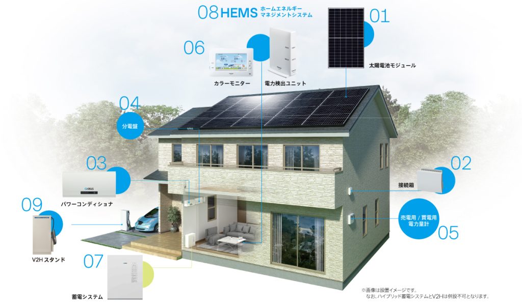 住宅用の太陽光発電システムは、太陽の光エネルギーを受けて太陽電池が発電した直流電力を、パワーコンディショナにより電力会社と同じ交流電力に変換し、 家庭内のさまざまな家電製品に電気を供給します。 一般の系統連系方式の太陽光発電システムでは電力会社の配電線とつながっているので、発電電力が消費電力を上回った場合は、 電力会社へ逆に送電(逆潮流)して電気を買い取ってもらうことができます。反対に、曇りや雨の日など発電した電力では足りない時や夜間などは、従来通り電力会社の電気を使います。 なお、こうした電気のやりとりは自動的に行われるので、日常の操作は不要です。